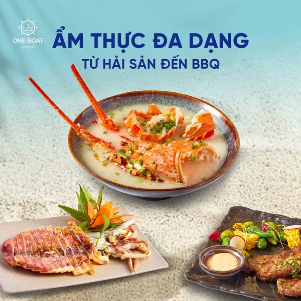 - Hải sản tươi sống: tôm hùm, tôm mũ ni, tôm tít, tôm sú, cua, ghẹ, mực, cà, hàu, sò, bào ngư,… chế biến cùng các loại sốt hấp dẫn chỉ có tại One Boat, ngon không thể chối từ