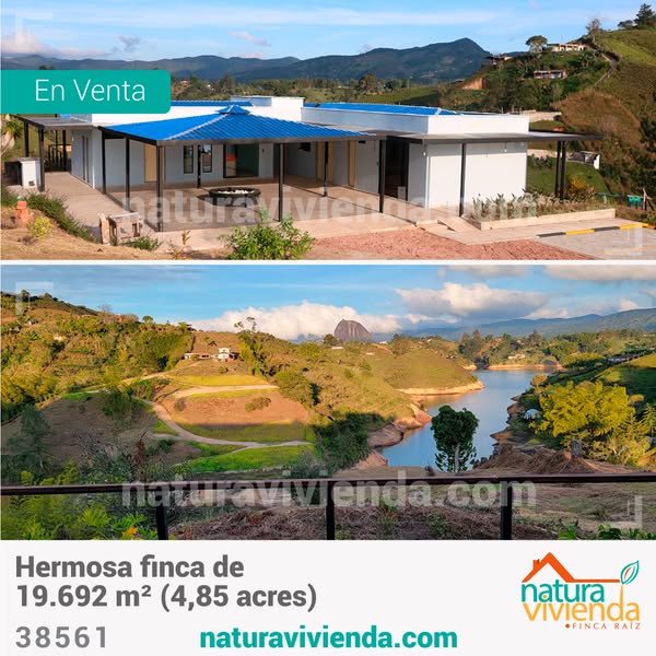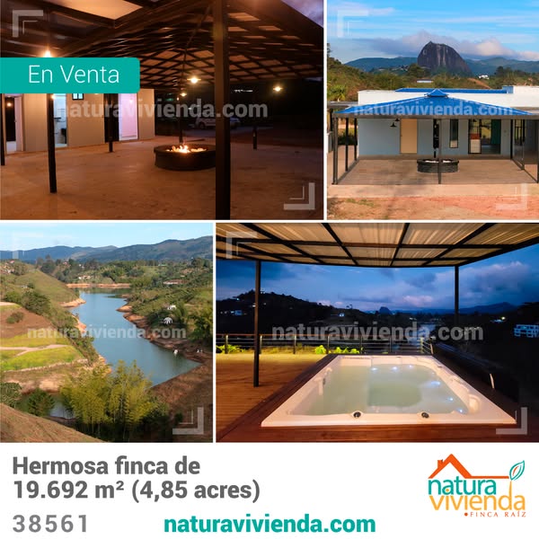 Hermosa finca moderna recién remodelada, ubicada en una de las mejores veredas de El Peñol, con acceso directo a la represa y vista frontal de la Piedra. Terreno de casi 2 hectáreas (Hermosa finca de 19.692 m² metros cuadrados, equivalente a 4,85 acres) a forma de península y rodeado por el agua del embalse. Construcción de 4 alcobas, 5 baños, cocina integral moderna, comedor, kiosk con chimenea central y gran deck con yacuzi, por un total de 330 metros cuadrados de construido.