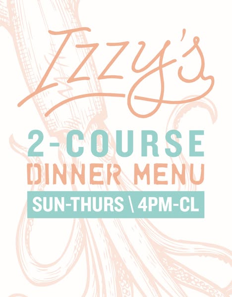 Join us at Izzy’s starting Sunday, July 13th for our NEW Two-Course Dinner Menu, available every Sunday through Thursday from 4pm to close!