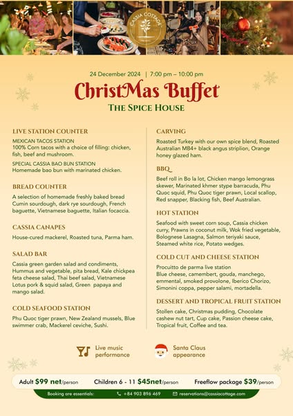 搜索关键词 christmas eve dinner, phu quoc restaurant, family christmas event, cassia cottage, christmas buffet, festive season, live cooking station, seafood buffet, santa visit, vietnam christmas优势 Exquisite buffet,Fresh seafood and live cooking stations,Delightful music and cocktail reception,Visit from Santa for kids