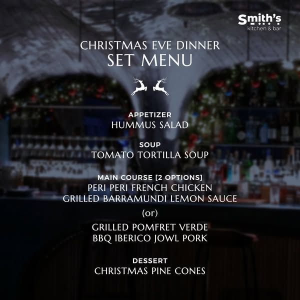 This Christmas Eve, let Smith’s Kitchen & Bar create a night where festive joy meets unforgettable moments. Whether you're here for a romantic dinner or a cozy gathering with friends, we’ve prepared everything to make your celebration special.
