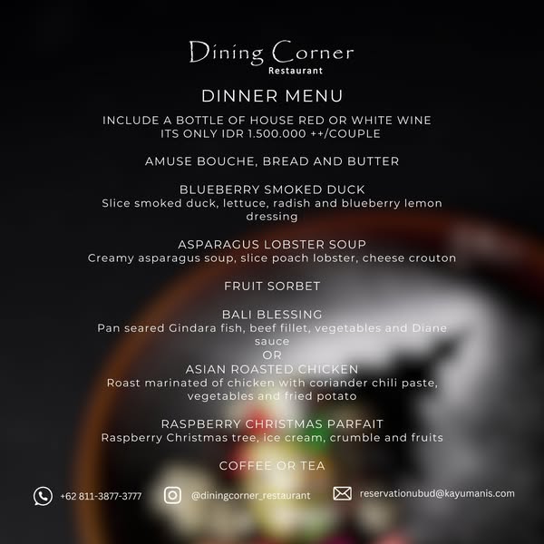Celebrate the magic of Christmas Eve with an enchanting dining experience at Dining Corner Restaurant, nestled in the serene beauty of Ubud. Indulge in a specially curated festive menu, blending the finest seasonal ingredients with authentic Balinese flavors and international culinary artistry.