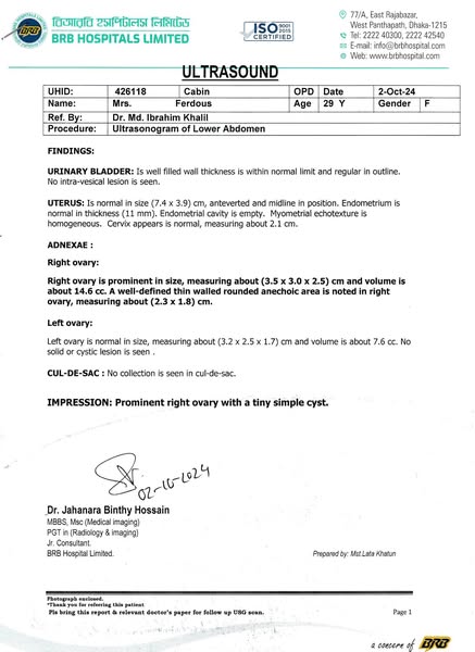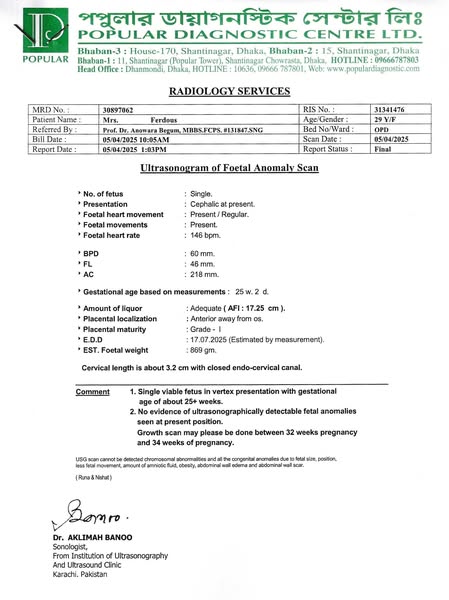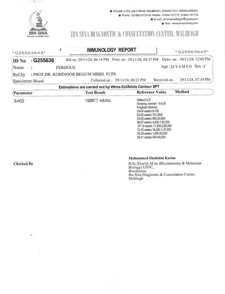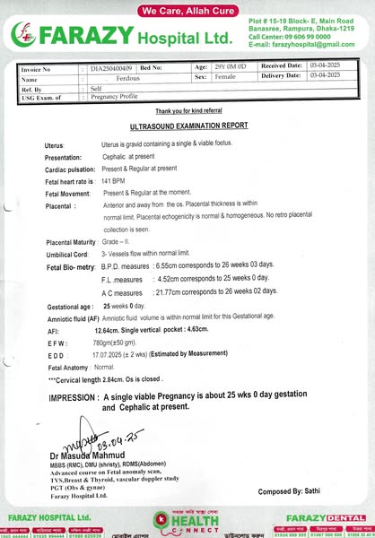 আমি সকল সমস্যা শুনে ১০/১০/২০২৪ ইং তারিখে এক কোর্স ঔষধ দিই আল্লাহ্র নামে। ২৯/১১/২০২৪ ইং তারিখে পরীক্ষা করে দেখি হাসানের স্ত্রী কনসিভ করেছেন আলহামদুলিল্লাহ্। EDD-17/07/2025.