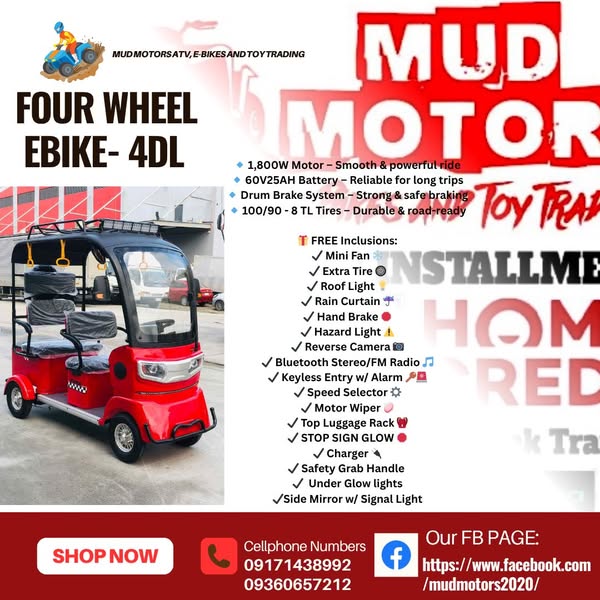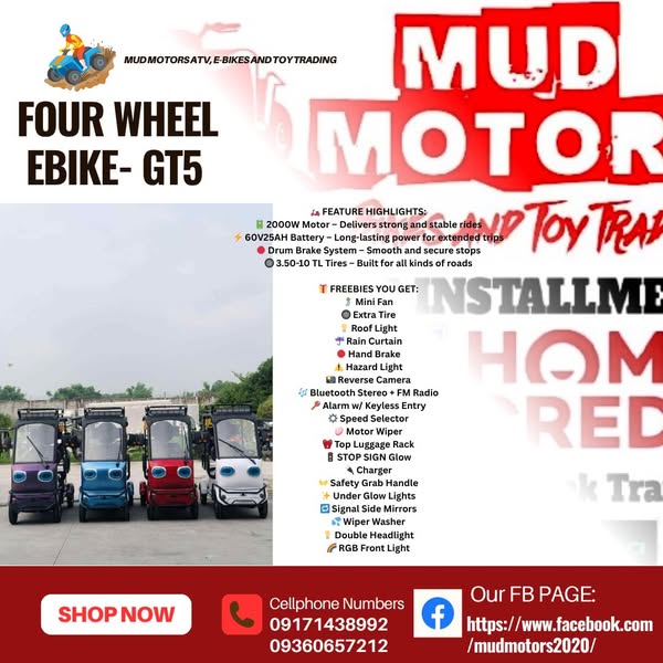 搜索关键词 Adult ATV Philippines, Electric Bikes Philippines, Kids Ride Ons, Mud Motors Santiago City, ATV Installment, UTV for Sale, Electric Bike Store, Affordable ATVs, Rechargeable Ride Ons, Gasoline Ride Ons优势 Wide selection of ATVs, UTVs, and electric bikes,Competitive pricing compared to malls,Installment options available,Cash-on-delivery and free delivery within Santiago City
