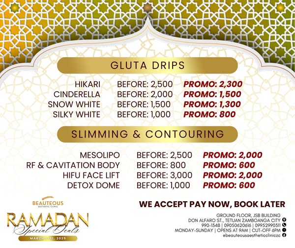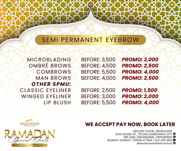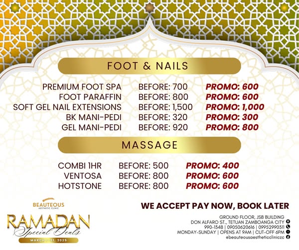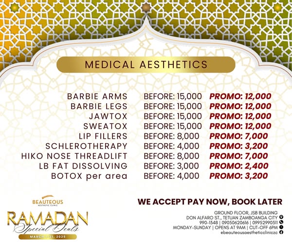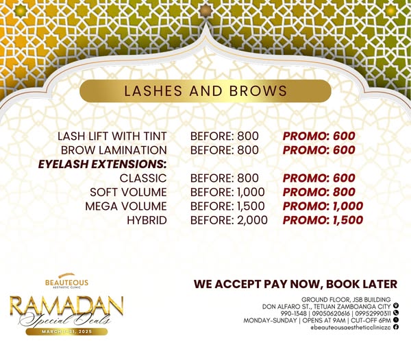 搜索关键词 Ramadan deals, Aesthetic clinic, Zamboanga city, Beauty treatments, Skin rejuvenation, Semi permanent makeup, Laser whitening, Slimming treatments, Nail services, Microblading eyebrows优势 Up to 50% off,Wide range of services,Convenient location in Zamboanga City