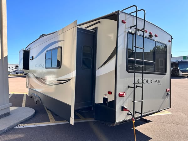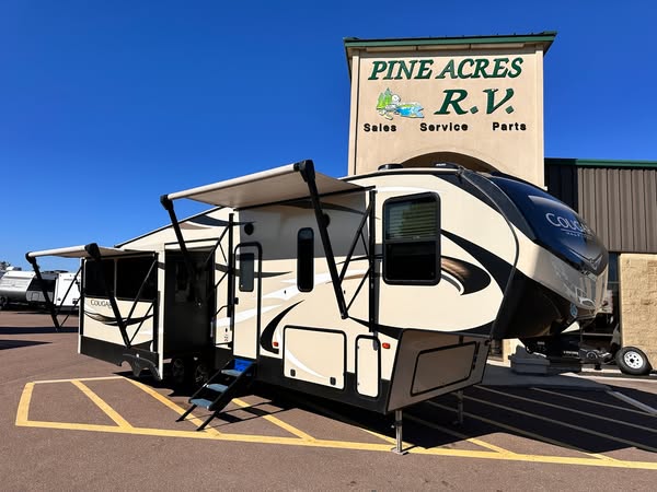 If you enjoy entertaining and prefer a fifth wheel over other RVs, take a look at this Cougar Half-Ton. From the Hitch Vision backup mirror providing a safe and easy way to hitch up, to the two slide outs in the main living area providing more interior floor space for visiting with other campers, you are sure to love this layout. Just imagine watching the pop-up TV and the entertainment center along the rear wall after a fun day outside. You have multiple seating choices including two recliners and a unique L-shaped sofa. The wardrobe slide in the bedroom offers additional storage and more floor space as well, plus there is more to find like the L-shaped peninsula kitchen countertop, and the convenient pivot hinge bath door. You even have a few options as well. Take a look, you will be glad you did!