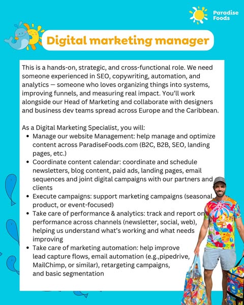 搜索关键词 Paradise Foods, Hiring, Caribbean Jobs, Yacht Provisioning, Digital Marketing Manager, International Team, Career Opportunities, Remote Work, Island Careers, Supply Chain优势 International Team,Fast-Moving Company,Revolutionizing Provisioning in the Caribbean,Remote Work Opportunities