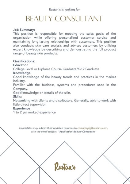 Are you passionate about delivering exceptional customer service and representing luxury brands? Rustan's is looking for talented individuals to be part of our prestigious team! Whether you're into fashion, beauty, home, or lifestyle, we have exciting opportunities awaiting for you.