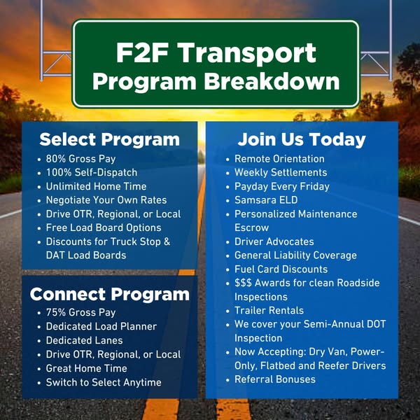 Swipe to see the breakdown of each program and the incredible benefits of joining the F2F family! If you’re interested in joining the F2F Transport family, call our recruiters at (423)771-9599 to learn more!