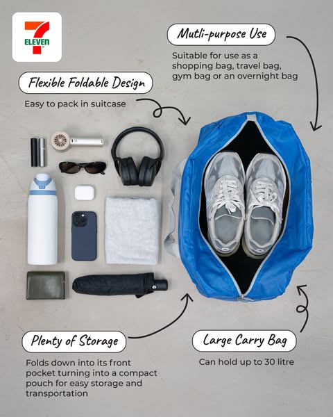 搜索关键词 foldable travel bag, travel bag, 7-eleven promotion, space saving bag, affordable bag, weekend getaway bag, gym bag, shopping bag, blue and black bag, limited time offer优势 Foldable and space-saving,Available in classic colors,Affordable price with purchase
