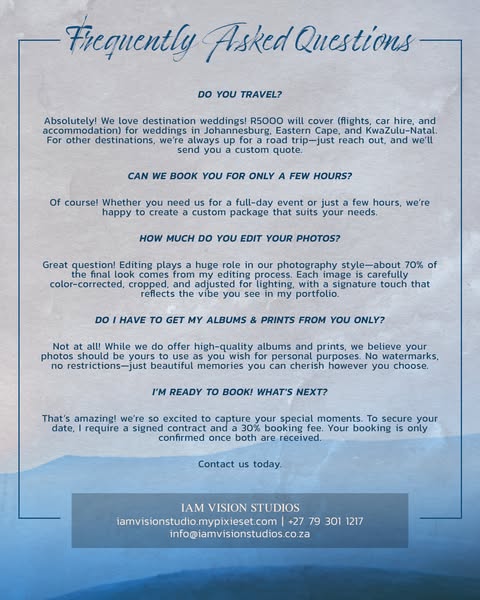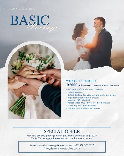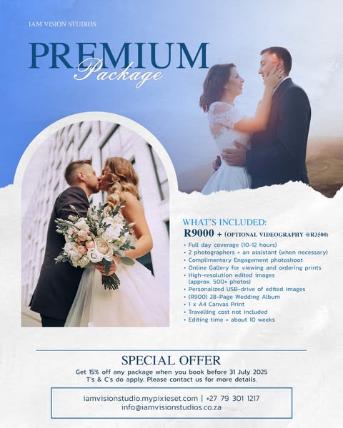 搜索关键词 wedding photography package, iAM Vision Studios, wedding discount, photography promotion, affordable wedding photography, wedding photo deal, wedding memories, capture your day, tailored wedding package, save money on wedding优势 15% Discount,Tailored Options (Premium, Standard, Basic),Customizable to customer needs