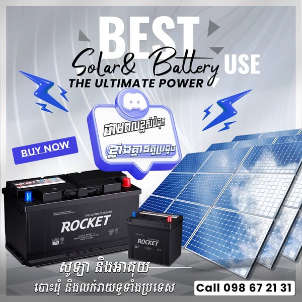 搜索关键词 Rocket battery, SMF battery, MF battery, Solar battery, UPS battery, Golf cart battery, Korean battery, Battery wholesale, Battery retail, Cambodia battery sales优势 Strong and unmatched performance,Wide range of battery types (SMF, MF, Solar, UPS, Golf Cart),Korean product,Available wholesale and retail