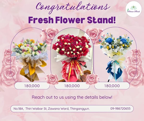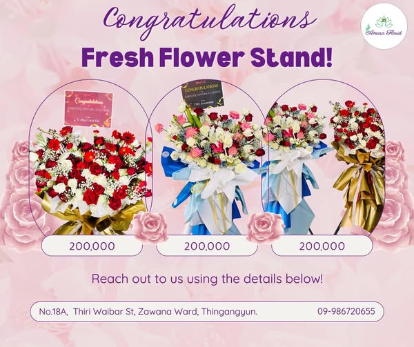 搜索关键词 flower stand yangon, flower delivery myanmar, wedding flowers, event decoration, amara florist, vip discount, royal customer, thingangyun florist, Zawana Ward flowers, flower basket优势 VIP Member 10% discount for loyal customers,Wide price range starting from 130,000 MMK,Wedding, Event and Floral Services