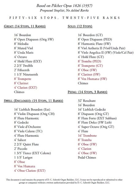 Pilcher Opus 1826 (III/25, 1937) is looking for a new home. We are in the process of assimilating the pipework and console. We would love to find a new home for this organ. Pilcher pipework is exquisite, and opus 1826 is no exception. Thankfully, everything is in wonderful shape. We've put together the following two stoplists here, which would re-imagine the organ's resources in a sensible context for a modern organ. Interested parties are welcome to reach out to us for more information.