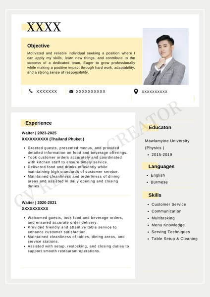 搜索关键词 resume writing service, cover letter service, visa application documents, school application support, career consulting myanmar, job agency services,sop writing, personal statement, myanmar job opportunities优势 Customizable for various purposes (job applications, school applications, visa applications),Wide range of services offered (resume, cover letter, portfolios, etc.),Support for overseas school applications (SOP, Personal Statement),New resume designs available