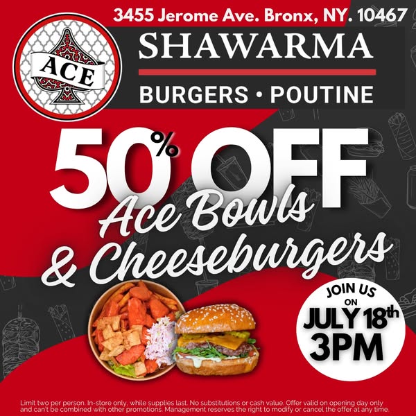 Flame-grilled, sauced up, and wrapped in toasted saj bread. Get your hands on the real deal — only at Ace Bronx July 18!