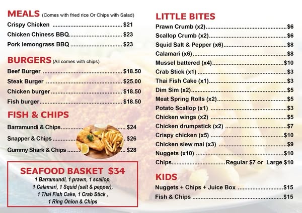 搜索关键词 burger steak, fried rice, fish chips, hot beef rolls, tasty meal options, crispy chicken, pork lemongrass, delicious takeaway, restaurant deals, Australian cuisine优势 Wide variety of meal choices,Mentions specific and appealing dishes,Highlights popular options like Fish and Chips