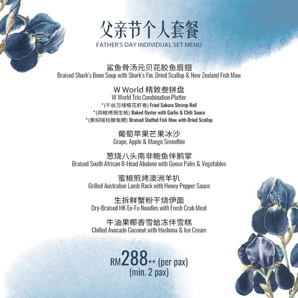搜索关键词 Father's Day Penang, Chinese Restaurant Penang, Georgetown Dinner, Family Dinner Promotion, Penang Food, W World Restaurant, Special Set Menu, Celebration Dinner,中式料理父亲节,槟城聚餐优势 Special Father's Day Promotion,Warm and inviting dining experience,Convenient location in Georgetown, Penang