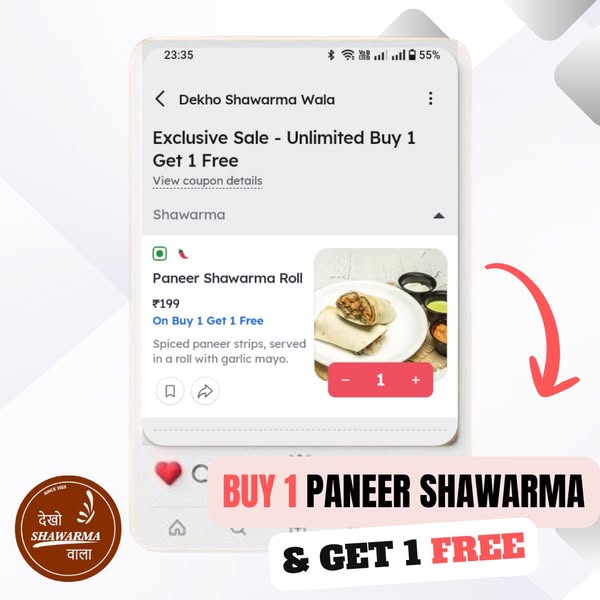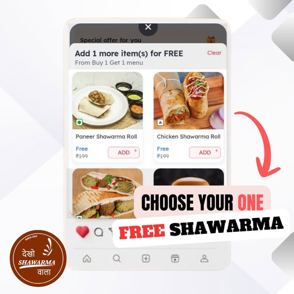 ✅ Hot & Fresh | 🔥 Packed with Flavour | 🚚 Fast Delivery ⏰ Hurry – This special offer is valid for a **limited time only**. Don’t miss out on this double delight! #DekhoShawarmaWala #Buy1Get1Free #ShawarmaLove #GurgaonEats #Sector67Food #ChickenShawarma #PaneerShawarma #ZomatoOrder #MiddleEasternFood #SpicyRolls #GurgaonFoodie #FastFoodDeals