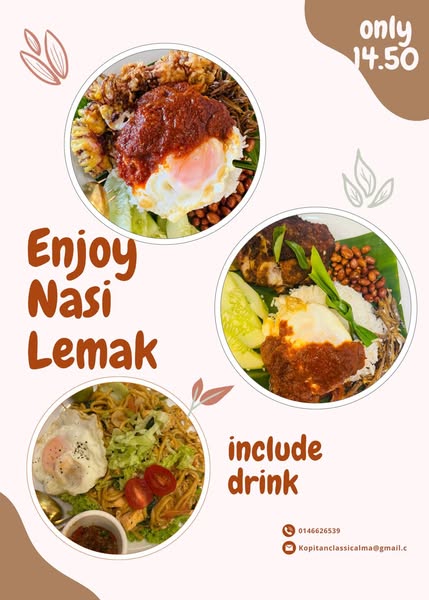 搜索关键词 kopitan classic alma, set lunch menu, summer fresh menu, nasi lemak, fried noodles, curry chicken, coconut smoothie, restaurant promotion, affordable lunch, Malaysia food优势 Affordable pricing,Variety of dishes,Refreshing drink included,Summer Fresh Menu for variety