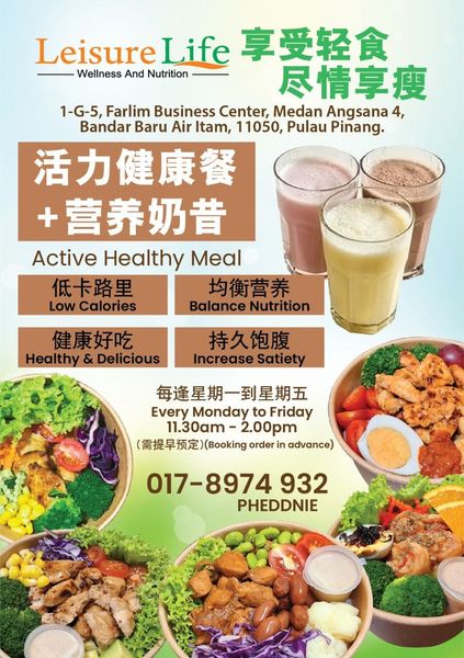 搜索关键词 healthy lunch, nutritional meals, weight loss, balanced diet, Pulau Pinang, Leisure Life, group discount, meal promotion, lunch specials, healthy food优势 Low calorie and healthy,Nutritious and balanced,Sustained satiety,4 people together, 1 free