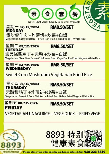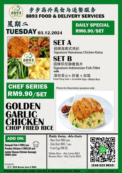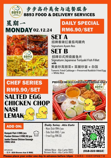 搜索关键词 lunch delivery, Penang food, affordable lunch, healthy food, Penang lunch delivery, value for money lunch, 8893 lunch delivery, daily menu, food delivery service, WhatsApp food order优势 Affordable price starting from RM6.90,Variety of menu options daily,Free delivery with minimum order of 3 sets,Easy to order via Whatsapp