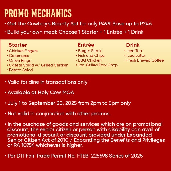 搜索关键词 Holy Cow MOA, Cowboy's Bounty, Meal Set Promo, Philippines Restaurant, Discounted Meal, Build Your Own Meal, Dine In Promo, Food Deal, Manila Restaurant, Limited Time Offer优势 Customizable meal set,Significant savings (up to ₱246),Variety of choices for starters, entrees, and drinks