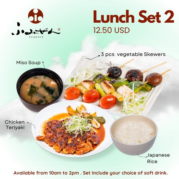 Indulge in Fumizen Restaurant’s special lunch set menu for just $12.50, available daily from 10 AM to 2 PM.