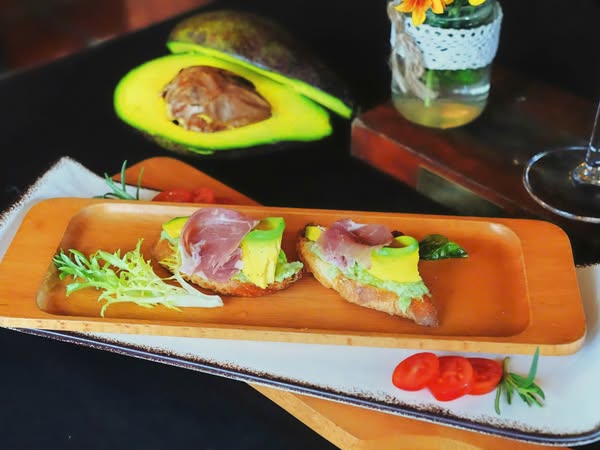 * Bánh mì nướng giòn phết hạt đậu nành Nhật nghiền cùng phomai sữa cừu Pecorino, phủ thịt đùi lợn muối vùng Parma và trái bơ tươi.