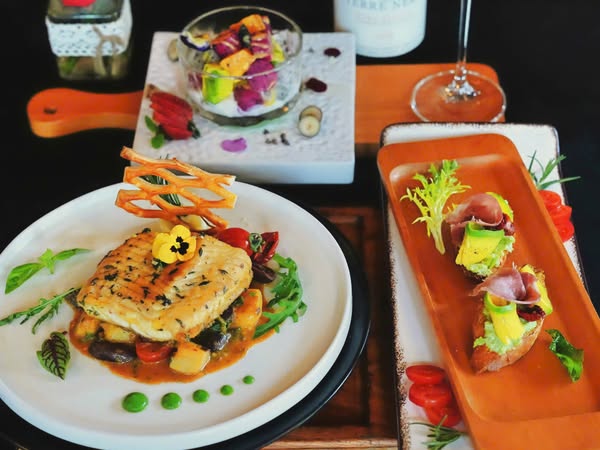 * Thăn cá Tầm áp chảo, dùng kèm trái ôliu Hy Lạp, cà chua cherry và khoai tây mini om vang trắng lá thơm.