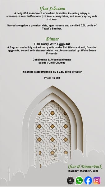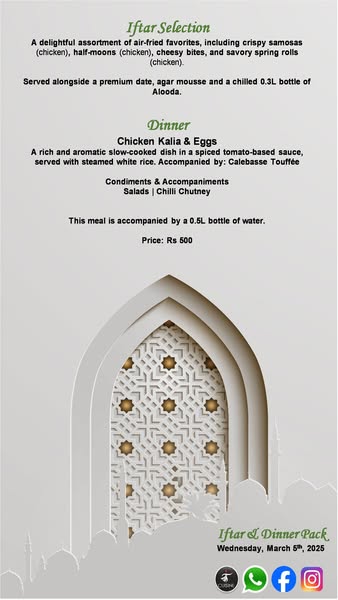 Unlike our usual three or four-course meals, this week’s selection is thoughtfully prepared to suit both Iftar and dinner, offering just the right balance of flavor and nourishment.
