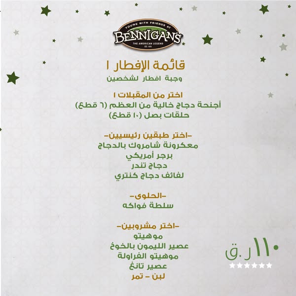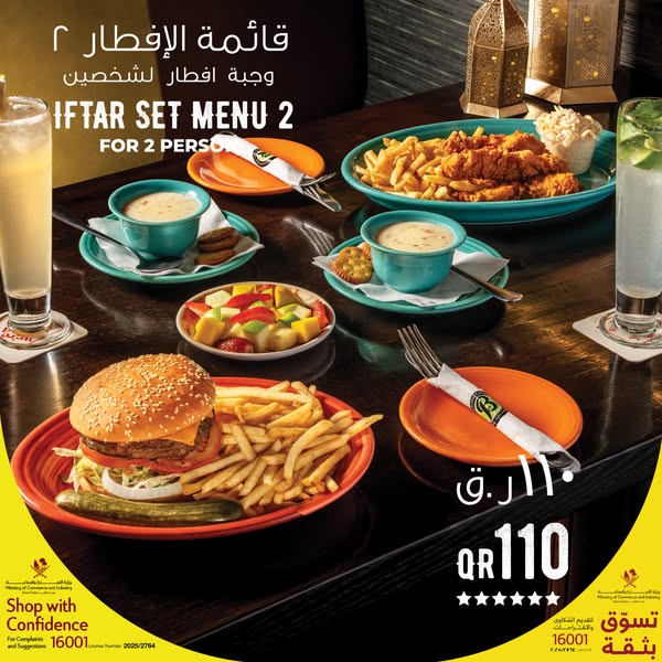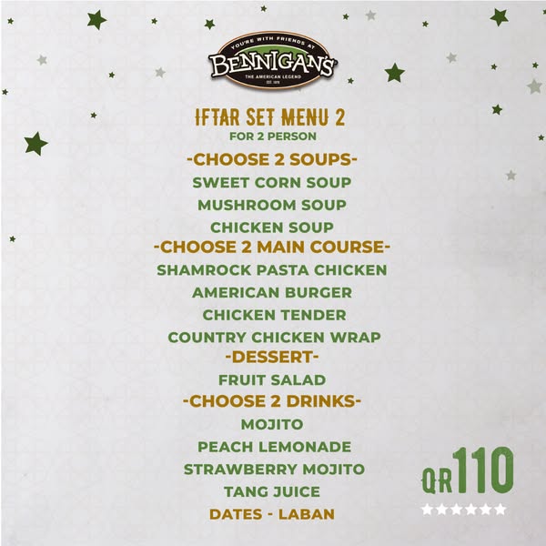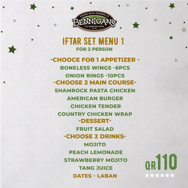 搜索关键词 Bennigan's Qatar, Ramadan Iftar, Sharing Combo, Qatar Tennis, Restaurant Promotion, Iftar Menu, Dine-in Delight, Food Offers, Ramadan Specials, Qatar Restaurant优势 Affordable price (QR 100 for 2),Sharing Combo options,Located at Qatar Tennis Federation,Specific to Ramadan