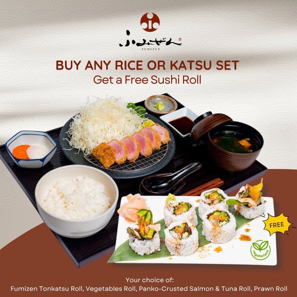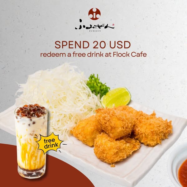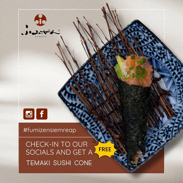 搜索关键词 japanese restaurant siem reap, katsu free sushi, siem reap power lunch, fumizen restaurant, sushi roll promotion, affordable lunch deal, restaurant promotion, august special offer, social media sushi, free temaki sushi优势 Free Sushi Roll with Katsu or Rice Bowl set,Free Temaki Sushi Cone with social media check-in,Affordable Power Lunch Deal,Refreshing drink at Flock Café with $20 spend
