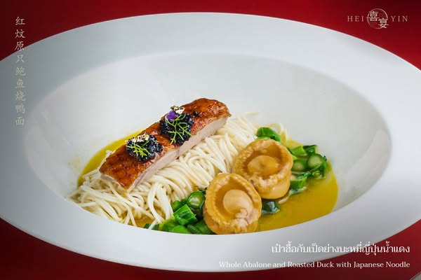 🔸 เป๋าฮื้อกับเป็ดย่างบะหมี่ญี่ปุ่นน้ำแดง – เส้นโซเมนเหนียวนุ่ม เสิร์ฟคู่เป๋าฮื้อและเป็ดย่างหอมกรอบ
