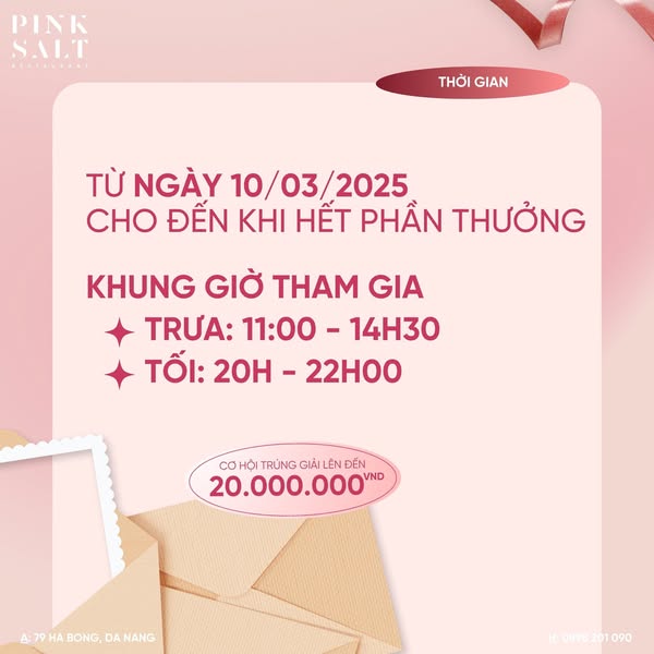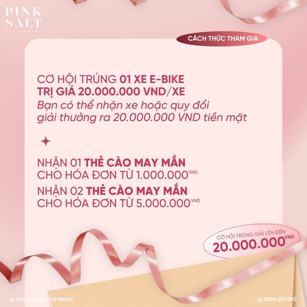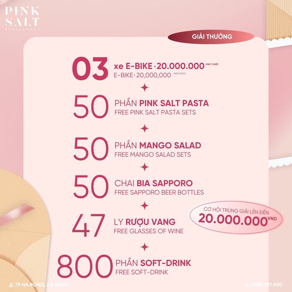 搜索关键词 Pink Salt Restaurant, Da Nang, E-Bike Promotion, Vietnamese Cuisine, Restaurant Da Nang, Food Promotion, Lucky Draw, Sapporo Beer, Mango Salad, Fusion Food优势 Chance to win an E-Bike,Multiple prizes (food and drinks),Flexible prize redemption (cash or prize)