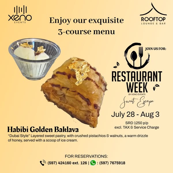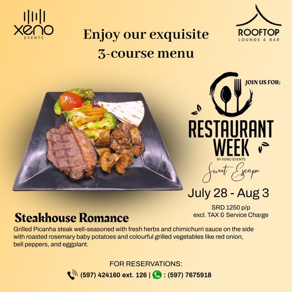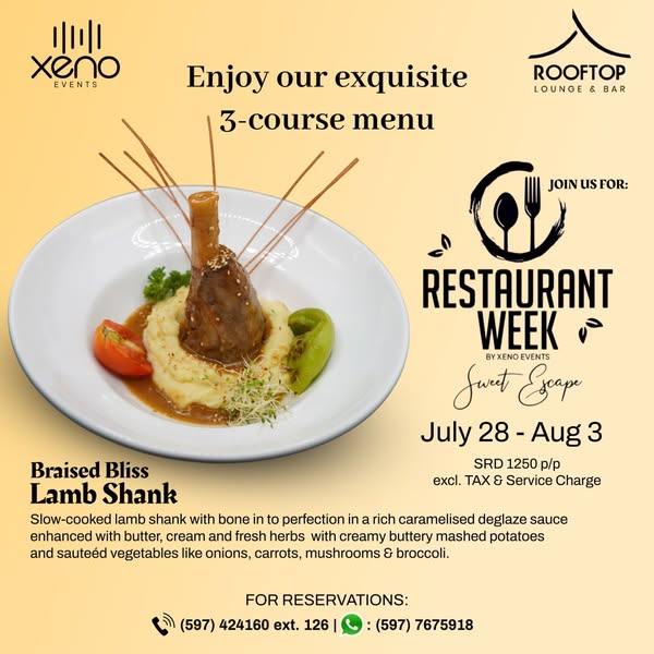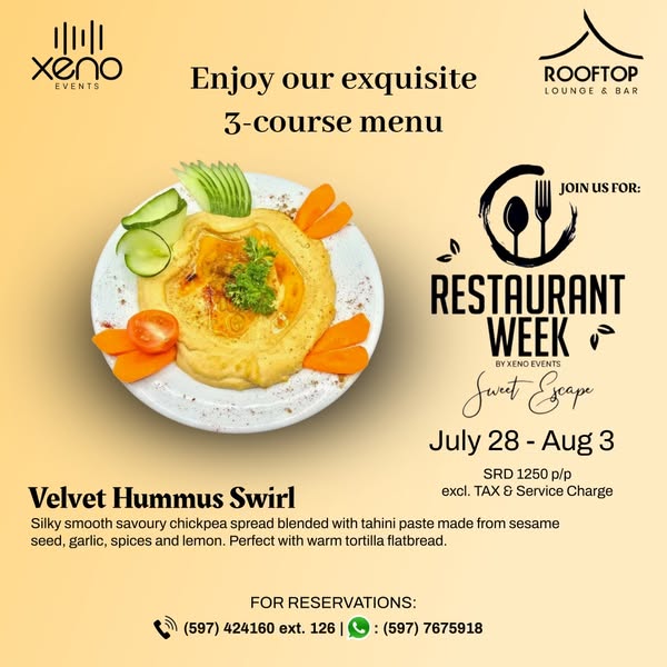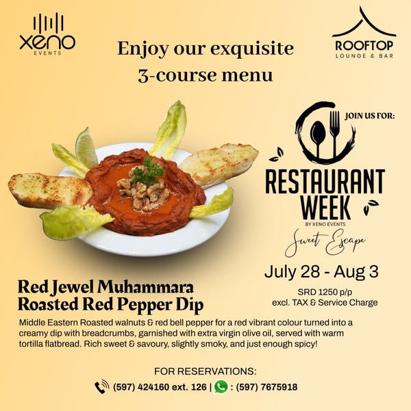 搜索关键词 restaurant week, paramaribo dining, rooftop lounge, sweet escape, rosé sangria, ramada princess, suriname restaurant, 3 course menu, fine dining offer, delicious food优势 Irresistible 3-course menus,Fusion of flavors,Complimentary Rosé Sangria