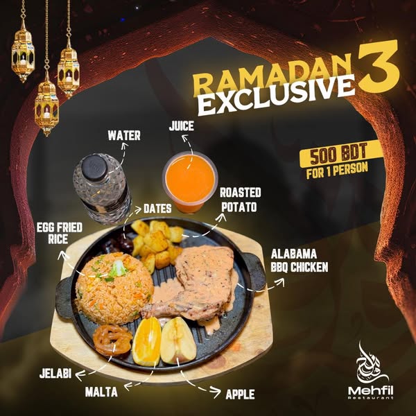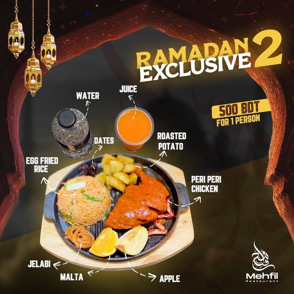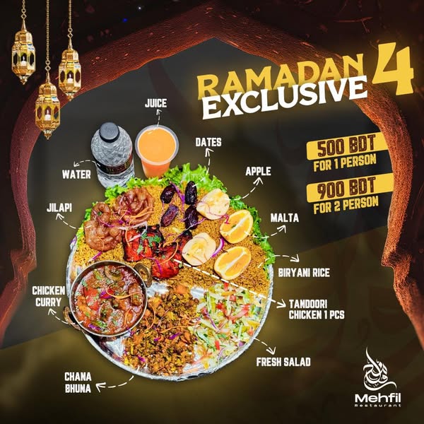 搜索关键词 Mehfil Sylhet, Ramadan Iftar, Iftar Platters, Sylhet Restaurant, Ramadan Feast, Family Iftar, Delicious Iftar, Iftar Experience, Ramadan Promotion, Iftar Specials优势 Hearty and flavorful Iftar feast,Designed for solo or shared dining,Convenient location