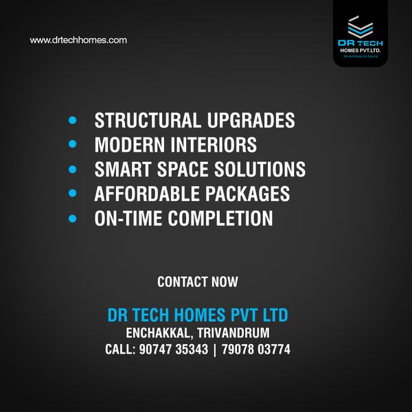 搜索关键词 DR Tech Homes, Home Construction, Trivandrum Real Estate, Free Site Visit, Free Consultation, Enchakkal Homes, Kerala Construction, Residential Building, New Home Construction, Home Design Services优势 Free site visit,Free consultation,Local presence (Trivandrum)