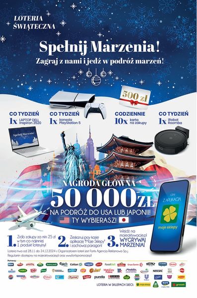 ✨ Loterię świąteczną: do wygrania jest codziennie 500 zł na zakupy, co tydzień laptop, konsolę PS5 lub robota sprzątającego Roomba, a główna nagroda to 50 000 zł na podróż marzeń do USA lub Japonii! Wystarczy zrobić zakupy za min. 25 zł z jednym produktem partnera.