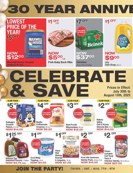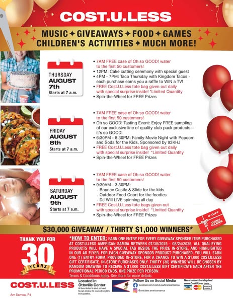 搜索关键词 Cost U Less, Anniversary Sale, Bulk Savings, Gift Card Giveaway, August Deals, Retail Promotion, Wholesale Prices, Limited Time Offer, Grocery Deals, Family Savings优势 Hot Deals,Free Giveaways,Food and Music,Chance to Win Gift Cards