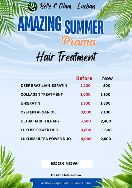 搜索关键词 Lucban Salon, Beauty Salon, Summer Promo, Salon Services, Belle and Glam, Beauty Treatments, Quezon Province, Salon Deals, Hair Services, Glamorous Look优势 Summer Promotions,Professional Beauty Services,Local Salon in Lucban