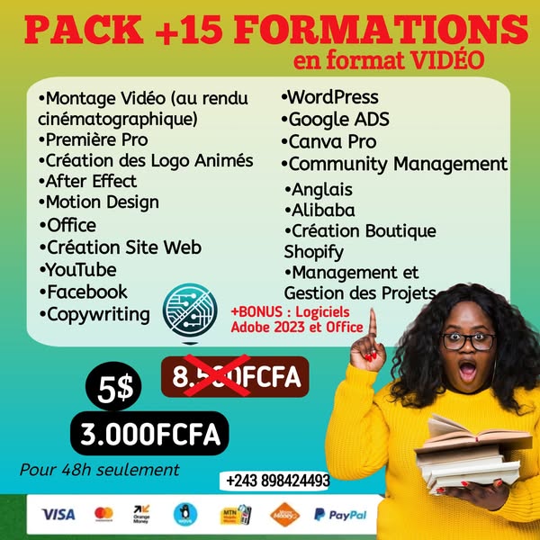Apprenez à créer, vendre, et réussir : Graphic Design, Bureautique, Marketing Digital, Anglais, Montage Vidéo et bien plus encore – une mine de compétences clés pour votre avenir. (Prix: 5$)