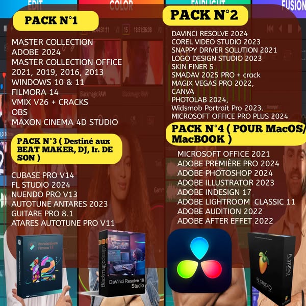 Office 2021, Windows 10/11, Filmora, DaVinci Resolve, Skin Finer, FL Studio, Antares, Adobe MacOS… le tout pour équiper votre PC ou Mac comme un studio professionnel. 10$/pack et 20.000fc/Logiciel