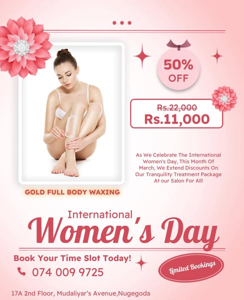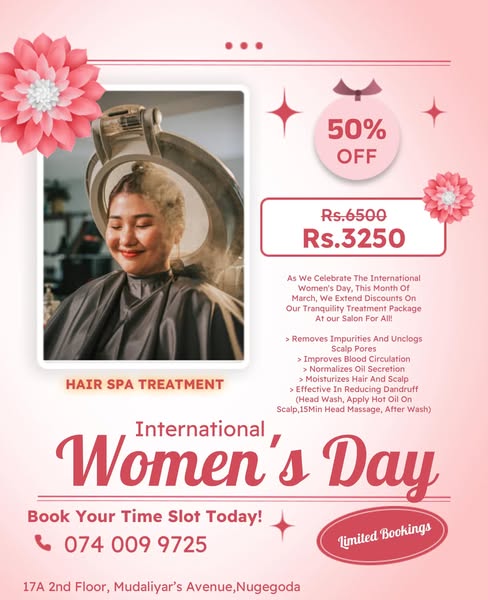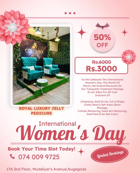 搜索关键词 Salon Colombia, Women's Day Offer, Hair and Beauty, Sri Lanka Salon, Luxury Pedicure, Hair Smoothing, Hair Chemical Treatments, Nugegoda Salon, Manicure Sri Lanka, Limited Time Discount优势 Exclusive Women's Day Offer,Significant Discounts (50% and 25%),Wide range of services,Luxury services offered