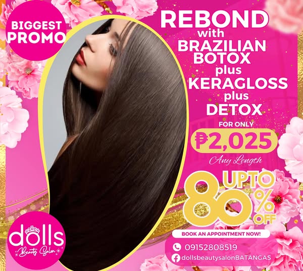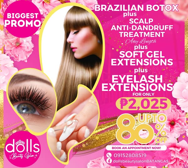 搜索关键词 beauty salon deals, batangas beauty salon, hair treatment promo, 2025 beauty deals, brazilian botox batangas, rebonding and balayage, eyelash extensions batangas, affordable beauty treatments, Dolls Beauty Salon, pamper yourself优势 Exclusive beauty deals,Affordable price (₱2,025),Free Gift Certificate,Wide range of treatments