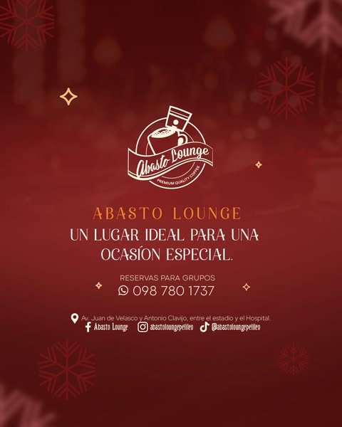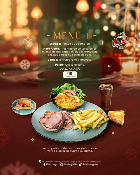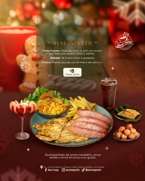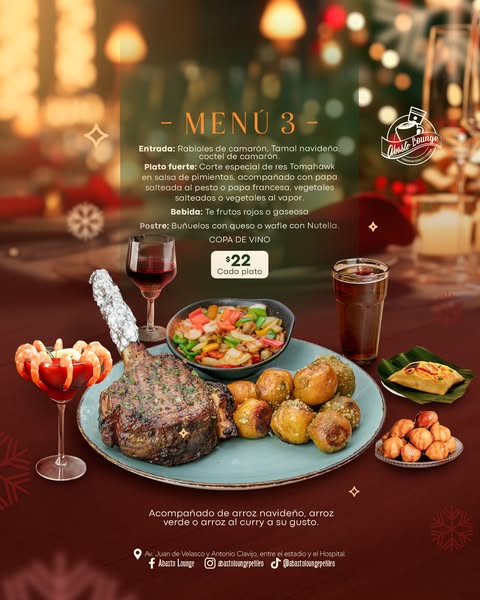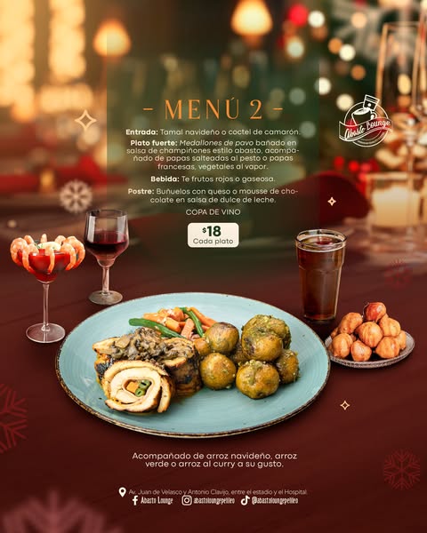 搜索关键词 Christmas menu, restaurant reservation, Abasto Lounge, holiday celebration, special occasion, grill food, quick food, Pelileo restaurant, Ecuador Christmas, festive dining优势 Festive atmosphere,Special Christmas menu,Ideal for celebrations