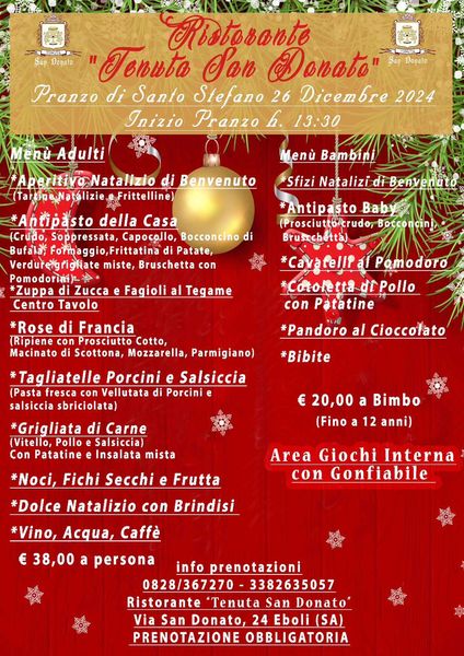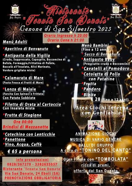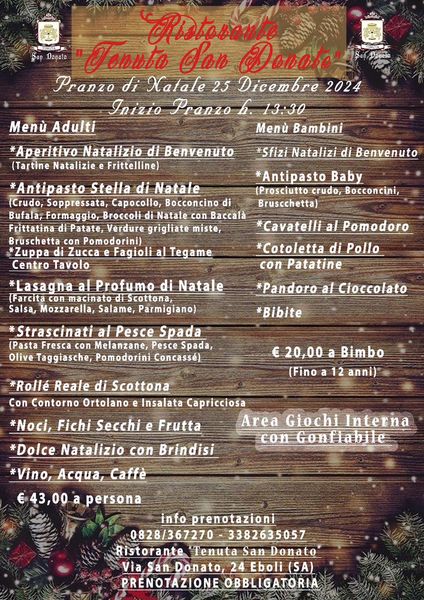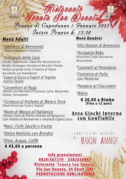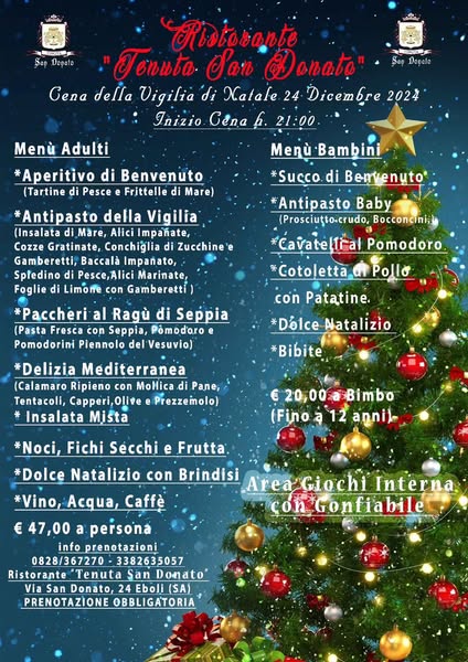 搜索关键词 Tenuta San Donato, Christmas dinner, New Year's Eve, Italian restaurant, Eboli restaurant, Holiday feasts, Family dining, Festive menu, Mountain view, Special events优势 Festive atmosphere,Traditional Italian holiday menus,Located in the mountains with scenic views,Family-friendly
