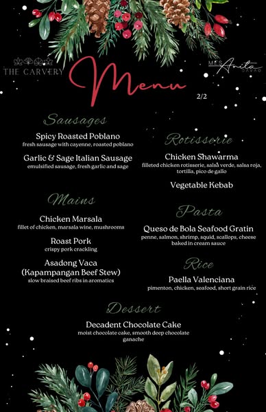Gather 'round with loved ones, indulge in a mouthwatering feast, and bask in the warmth of a perfectly festive atmosphere at MesAnita Davao. Join us for a one-night only Christmas dinner buffet on December 20, 2024, Friday. Php 1,800/net per head. Limited seats only. Message us for bookings.