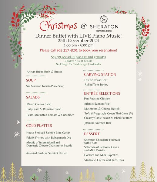 A Christmas feast awaits… Join us on December 25 for a special holiday dinner buffet with live piano music in the ballroom. Perfect for gathering with family and friends! Reserve your seats by calling 905 317 4501 now.