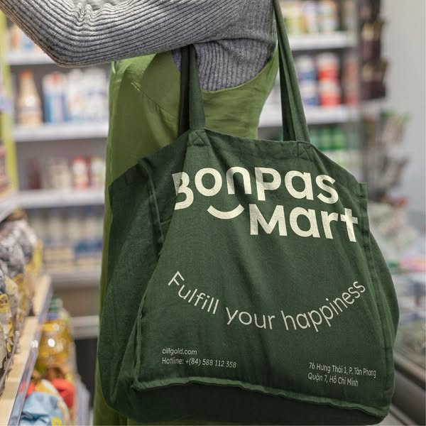搜索关键词 Bonpas Mart, Imported goods, Da Nang, supermarket, Brand Identity, happy shopping, Fresh products, groceries, Cillgold agency, Vietnam retail优势 Diverse range of imported products (food, cosmetics, household goods, fresh fruits),Modern and youthful brand image,Commitment to bringing joy and convenience,Dynamic logo design with flexible application,Key visual elements emphasizing freshness and warmth